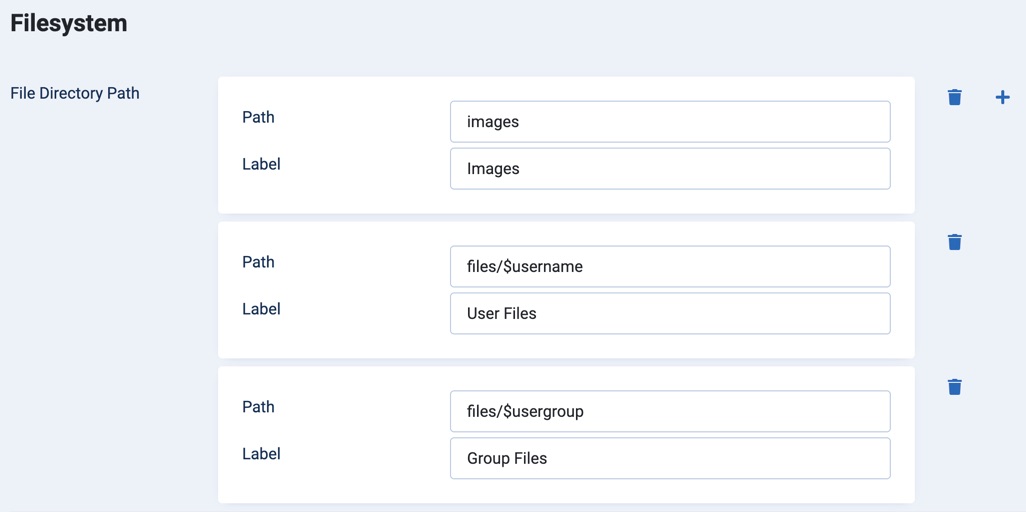 The File Directory Path option - found in Editor Profiles → Editor Parameters → Filesystem and per-plugin under Plugin Parameters (e.g. Image Manager Extended) - now supports multiple paths, each with an optional label. In practice, this lets you map several folders as root locations (each optionally labelled), shown as a labelled root list in the browser. Path variables remain supported for dynamic values. If no label is provided, the final segment of the path is used (e.g. images/files → Files).